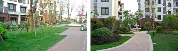 楊經(jīng)理說:"紫荊東郡的植物配置以統(tǒng)一中富于變化為原則,上層苗木主要選擇大規(guī)格的香樟、無患子和馬褂木等,中下層則以桂花、雞爪槭、紅葉石楠球、金森女貞球等常見的球類灌木及地被苗進行組團,苗木的種類雖然不是很豐富,但在配置上卻形式多樣,特別是通過在施工時對設(shè)計的再深化,要求在植物種植時,樹形、色彩、線條、質(zhì)地及比例都要有一定的差異和變化,顯示多樣性,但相互之間又有一定的相似性,從而使得整體的植物配置在和諧統(tǒng)一中顯得生動活潑,簡單而不單調(diào),統(tǒng)一而不呆板,營造出一種寧靜、閑適的氛圍。"