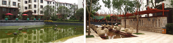 在紫荊東郡小區(qū),水景隨處可見,從主入口兩側(cè)近50米的景觀橋水景,到入口正前方一個大型的石雕噴泉,再到小區(qū)里面幾條主干道交匯的十字路口的小型地面噴泉,中心水景上的圓形石雕噴泉,特別是不遠處的動物噴泉雕塑,只只鶴低頭凝思,細長的水流從鼻端的出水口處流出,落入下方的水池里,更是格外引人注目。"這些水景小品具有的藝術(shù)特性與審美效果,加強了整個景觀環(huán)境的藝術(shù)氛圍,成為讓空間環(huán)境生動起來的關(guān)鍵因素,在提高小區(qū)藝術(shù)品質(zhì)和景觀形象的同時,更給人們帶來美的享受。"楊經(jīng)理如是說。