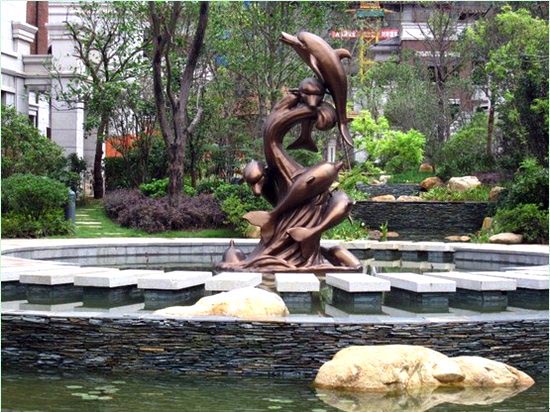 景觀小品是景觀中的點(diǎn)睛之筆,一些造型優(yōu)美的藝術(shù)小品,更是讓空間環(huán)境生動(dòng)起來的關(guān)鍵因素。在保利·拉菲,帶有濃郁意大利氣息以及中西文化合璧的景觀小品隨處可見。入口處的歐式水景幕墻利用中國黑、黃銹石燒面、砂巖雕花巧妙結(jié)合,形成一幅精美的藝術(shù)畫面,幕墻中不斷噴涌的水流激起陣陣白色的漣漪,將后面寫有“保利·拉菲”字跡的景墻襯托得清爽大氣,在陽光照耀下,呈現(xiàn)出流暢、動(dòng)感的畫面。特別引人注目的是模仿圓明園四大獸首制作的水景雕塑,牛首、豬首、猴首、虎首這四大獸首,形象上采取了西方動(dòng)物的特征,融合了中國的傳統(tǒng)文化與西方的特色魅力,當(dāng)細(xì)長的水流從四大獸首的口中源源不斷地吐出、落入前方的水池里時(shí),就與從下而上噴出的涌泉形成互動(dòng),一上一下、一細(xì)一粗,前方再配以色彩絢麗的花草,形成一處動(dòng)靜相宜、格調(diào)清新的水景。