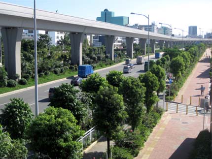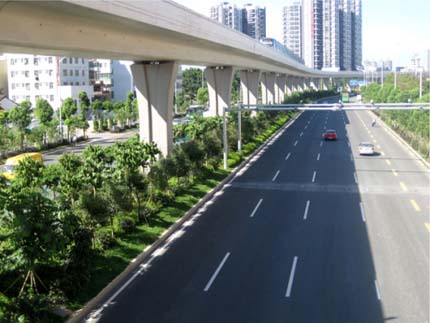 如今,開車行進在這條道路上,干凈整潔的路面、開闊通透的視野、清新自然的景觀,給人帶來閑適、愜意的感覺?!耙匀藶楸荆鹬刈匀弧钡木G化理念,體現(xiàn)在景觀中的每個細節(jié);自然環(huán)境與城市環(huán)境的密切結(jié)合,使高架橋的道路通行功能與橋下中央綠化帶的生態(tài)功能有機融合。整條道路,不僅體顯出深圳這個濱海大都市獨有的景觀特色,更彰顯出這個城市的生機活力與熱情奔放。