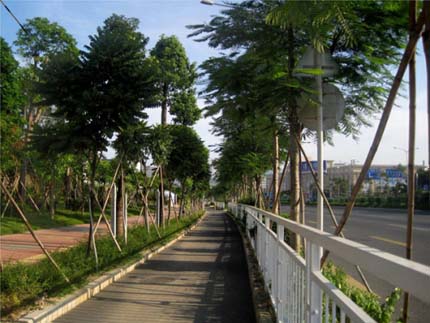 眼前的這條道路開闊大氣、綠色生態(tài),而當初施工時,卻面臨著很多難題。該項目定位較高,工期短,交叉施工嚴重,更經(jīng)歷了濱海的臺風季節(jié)天氣,所以施工中對施工工序組織、材料組織及機械勞動力的組織顯得尤為重要;由于施工范圍處于交通繁忙的205國道深圳段,對施工現(xiàn)場車輛的疏導及路邊作業(yè)的圍護等的要求都需嚴格把控;為了保證景觀效果,對苗木的要求比較高,很多假植的苗木需要用保鮮的方法長途運載到施工現(xiàn)場進行種植?!笆┕ぶ忻媾R的各種不利因素不但增加了工程成本,更加大了施工難度,但在項目部全體人員工的共同努力下,最終克服種種困難,圓滿完成了任務,展現(xiàn)了杭州市園林綠化工程有限公司優(yōu)質(zhì)高效、創(chuàng)新進取的企業(yè)形象,受到各方的一致好評?!毙煜蛎鞯囊环喍淘捳Z,卻讓我們感受到了施工期間的諸多辛苦。
