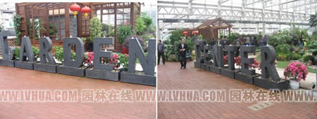 一進(jìn)入室內(nèi),首先映入眼簾的就是“GARDEN CENTER”(花園中心)幾個(gè)大字,仔細(xì)一看,上面還有流水青煙,十分吸引人的眼球?;▓@中心內(nèi)不僅展示了各式各樣的室內(nèi)植物、庭院植物,更有各種肥料、工具等園林資材展示。
