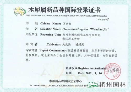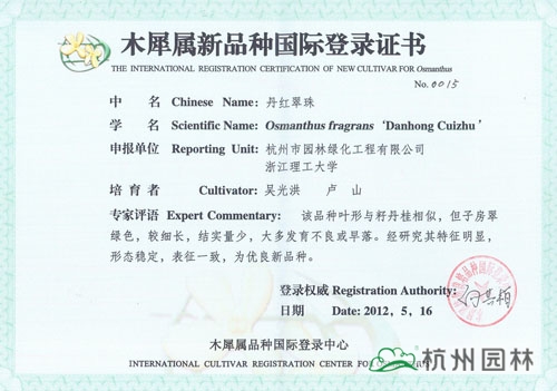 近日,由杭州市園林綠化工程有限公司與浙江理工大學聯合研發(fā)的“丹紅翠珠”、“杭州丹桂”、“杭州黃”、“菊瓣”、“萬點金”5個桂花新品種獲得木犀屬新品種國際登錄證書。截止目前,杭州園林已經有12個桂花品種獲得此項國際登錄權,充分展示了企業(yè)在桂花研究方面的突出成績。
