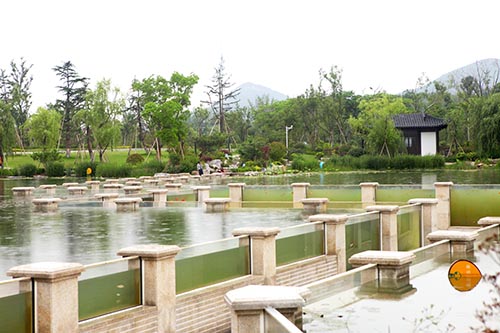 沉水廊道:總長148米,其中,北面60米,南面88米,整個(gè)廊道內(nèi)湖水域面積達(dá)1.1萬平方米,堪稱中國廊道景觀之最。廊道兩側(cè)以透明的亞克力玻璃隔斷湖水,通過先進(jìn)的水凈化系統(tǒng)對(duì)湖水進(jìn)行循環(huán)凈化處理。遠(yuǎn)觀沉水廊道,宛如蛟龍蜿蜒盤桓于湖面之中,將整個(gè)云龍湖一分為二,猶如太極中的陰陽兩儀,充分體現(xiàn)了道家文化;兩頭又與玉珠島呈二龍戲珠之勢(shì)。游人行走其中,可以欣賞各種魚類嬉戲于水生植物之間,仿佛置身于水族館之中,同時(shí)又可以觀賞到玉珠島的奇石、奇花與奇樹??芍^是匠心獨(dú)運(yùn)。