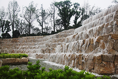 入口水景開闊大氣,行道樹陣整齊劃一。一場歌劇的序曲,不管是澎湃激昂,還是歡快活躍,抑或是柔情舒緩,都將對整個局情起著舉足輕重的作用。入口景觀的作用同樣如此,它是整個園林工程留給人們的第一印象。走進項目主入口,寬40米、高10米的寬闊水景,高達7級的層階落差,水流層層跌落間,水聲轟鳴,仿佛一道瀑布橫掛眼前。3000平方米的地面鋪裝,全部采用50毫米厚的深灰色和芝麻白花崗巖,走在上面,平坦、踏實。兩側(cè)的花壇,邊緣鋪設(shè)手法也呈臺階狀,蘑菇石貼面,花崗巖壓邊,與水景遙相呼應(yīng)?;▔械闹参?,上層選用香樟、銀杏、櫸樹,中層用櫻花、紅葉李,下層用麥冬、水蠟、花石榴及草花,再加上造型樹的點綴,營造出群島效果,使得整個入口景觀莊重典雅,大氣天成。