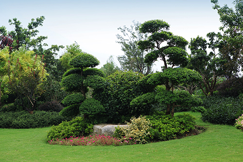 在項目主入口、次入口、中心景觀及一些重要景觀節(jié)點,黑松、女貞、水蠟、五針松、紅花檵木、紫薇等造型樹木,宛如萬綠叢中的一點“紅”,彰顯出獨特的氣韻與品味,起到畫龍點晴的效果。