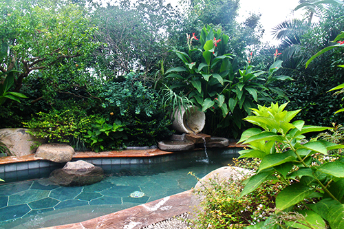露天泳池熱帶風情,溫泉泡池仿若天成。露天泳池區(qū)景觀獨具特色,選用華棕、棕櫚、布迪椰子、加拿利海棗等熱帶植物作為主景,營造出簡約大方、層次分明的濃郁熱帶園林風情。為了提高這些熱帶植物的成活率,降低后期的養(yǎng)護成本,這批植物都經(jīng)過馴化,較能適應(yīng)吳江的氣候條件。該區(qū)面積較大,從酒店的觀景平臺上往下看,泳池中間的小島就像彎彎的小船,仿佛要順流而下;水質(zhì)清澈見底,水底大面積的藍色和黃色玻璃馬賽克,營造出波光鱗鱗的效果,流動的線條瞬間充滿了生機和活力,整個泳池仿佛都動了起來。