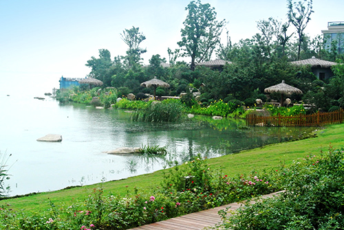 該項目將“以人為本,尊重自然”貫穿于設(shè)計到施工的各個環(huán)節(jié),為了最大限度地保護太湖水域環(huán)境,各個施工環(huán)節(jié)中,因地制宜,因材施用,在駁岸處理中,通過草坪入水、水生植物種植、景石運用等方法,在充分保護原有湖岸的基礎(chǔ)上,加強對湖水水質(zhì)的凈化,營造出生態(tài)、自然的湖岸景觀,成為項目中的一景。此外,種植的植物,大量選用當?shù)剜l(xiāng)土樹種,既營造出濃郁的景觀特色,又有利于提高植物的成活率,減少后期的養(yǎng)護費用,有效節(jié)約了工程成本。