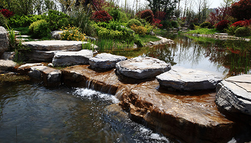 其中,人工湖面積7000平方米,小而精致,可謂是整個公園的“點睛之筆”。由親水平臺區(qū),源頭區(qū),中心湖面區(qū),鄰水生態(tài)區(qū),橋梁區(qū)構(gòu)成。湖面區(qū)域貫穿整個工程,沒有自然條件的襯托,完全由人工園林造景手法完成,在鄰水景觀帶種植睡蓮、荷花、再力花、千屈菜、鳶尾、蘆葦?shù)人参铮瑺I造生態(tài)岸線,同時選擇其他親水植物,如美人蕉、碧桃、楊柳、水杉作為過渡和背景,虛實結(jié)合,營造出多方位的景觀效果。湖面雖小,但結(jié)構(gòu)完整,假山疊水,拱橋,原石臨水橋,湖邊卵石生態(tài)群落一應(yīng)俱全。其中,景石主要使用了安徽的靈璧景石,約7000噸,堆疊出水源、暗橋、親水沿岸等景觀。