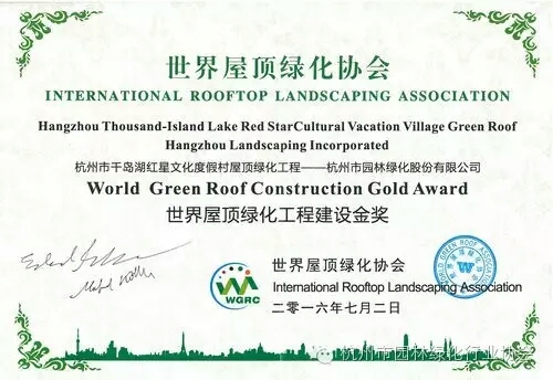 近日,在云南昆明召開的2016世界生態(tài)城市與屋頂綠化大會上,協(xié)會會員企業(yè)——杭州市園林綠化股份有限公司承建的杭州市千島湖紅星文化度假村屋頂綠化工程榮獲“世界屋頂綠化工程建設(shè)金獎(jiǎng)”。