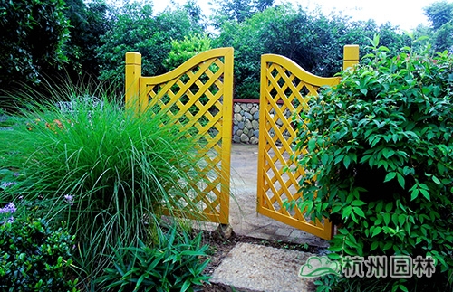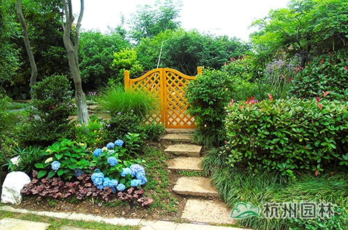 門(mén)口安裝高1.2m、寬1.5m的對(duì)開(kāi)推入式木門(mén),以此吸引游人眼球;花園入口采用常綠灌木、花灌木、宿根花卉相結(jié)合的手法,將花園內(nèi)的景觀進(jìn)行了遮擋,同時(shí)營(yíng)造出引人入勝的入口景觀。