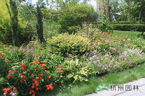 人來人往的杭州火車東站西廣場,草坪碧綠,樹木蔥郁,更有一座名為“西湖印象”的立體花壇吸引著眾多游客的眼。而在廣場通往天城路方向的一片草坪里,一處100平方米左右的花境小品卻格外引人注目,紅黃粉交相輝映的五色梅、葉秀花艷的香彩雀、紫色優(yōu)雅的翠蘆莉、飄逸秀氣的小兔子狼尾草、青翠挺立的直立冬青、葉色嫩黃的黃金香柳……豐富的品種,艷麗的色彩,既展現(xiàn)出植物的色彩美,又營造出豐富的群落美,使得這處小花境成為這片風(fēng)景的點(diǎn)晴之筆。
