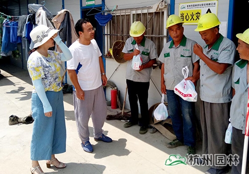 7月20日,工程總監(jiān)胡建深和工會(huì)女工委員鐘晴來(lái)到了安慶市2017城區(qū)綠化提升工程施工管養(yǎng)一體化工程現(xiàn)場(chǎng),先后為6號(hào)游園、集賢路等項(xiàng)目做綠化養(yǎng)護(hù)的工人們送上了防暑降溫用品,并感謝他們的辛勤付出,囑咐大家一定要做好防暑措施。