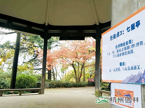 本次活動的終點為玉皇山頂?shù)摹敖挥[閣”。玉皇山是杭州絕佳的觀秋景高地,站在山頂,可俯瞰杭州全城,八卦田的神秘、西湖的絢麗等盡收眼底;山上則是古樹參天,紅葉似火,黃葉賽金,彩林岑巒疊峰,如入畫里。大家從玉皇山北門上山,途經(jīng)林海亭、老玉皇宮、櫻花地、紫來洞天、七星亭,最后到達山頂?shù)摹敖挥[閣”。此次登山途中設(shè)立了3個任務(wù)點,參加活動人員需要完成相應(yīng)任務(wù),才能蓋章通關(guān)。