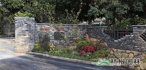 錢三組共有31戶人家,以前,這里家家都是高墻大院,雖然每家的小樓都蓋得很有特色,但卻被高高的院墻擋住了院內(nèi)的風(fēng)光,而且整體綠化景觀單一,缺乏本土特色和文化氣息。如今,高高的圍墻被拆除,改為以舊青磚為主,搭配鋁合金欄桿,以老石板、舊瓦片、老石磨、老石鼓等作為點(diǎn)綴,懷舊物件與現(xiàn)代元素有機(jī)結(jié)合,營造出全新的集古樸與時(shí)尚于一體的敞開式景墻。在景墻內(nèi)側(cè)種植桂花、意大利絡(luò)石等綠籬,墻外地面種植麥冬等常綠草本植物;在每家庭院入口兩側(cè)和一些節(jié)點(diǎn)處設(shè)置小花境,種植各類常綠、色葉、草花等植物,營造出風(fēng)格多樣的花境景觀,在軟化景墻生硬感的同時(shí),景觀更加豐富多變。