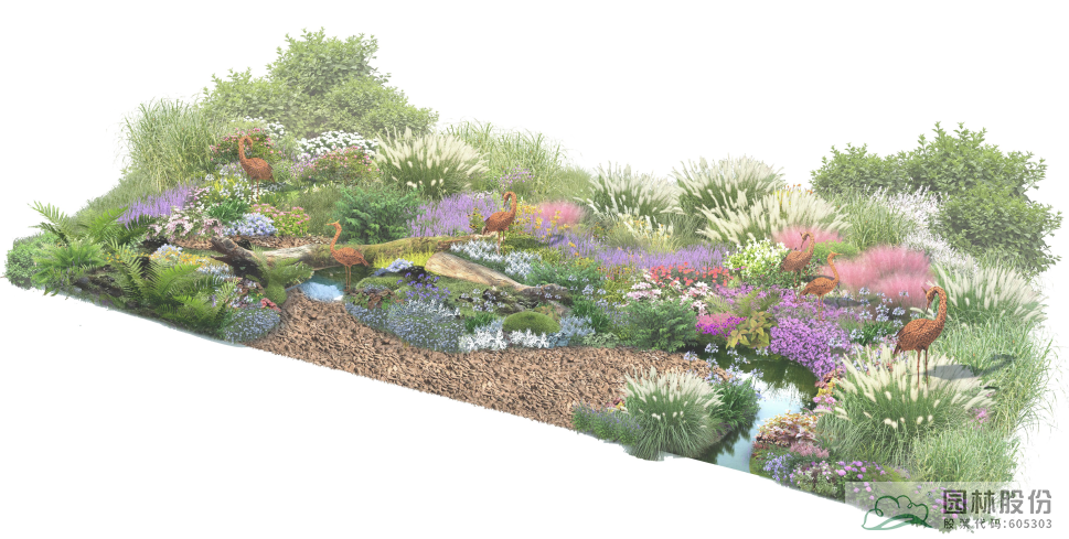 以千鳥花、密花千屈菜、美女櫻等觀賞草本花卉為主,點(diǎn)綴以小兔子狼尾草等觀賞草,重現(xiàn)濕地草甸中繁花似錦的美麗場景。