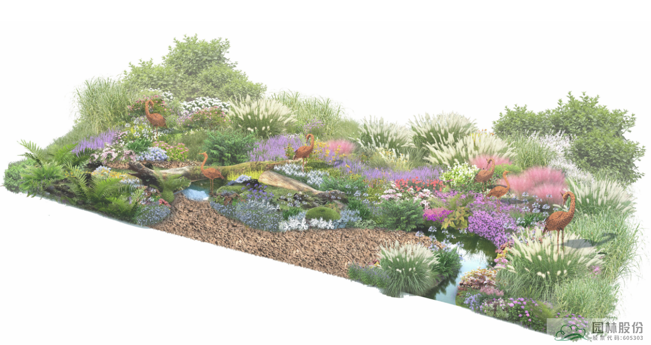 《澤?頌》的設(shè)計(jì)將花境與濕地相結(jié)合,以花之靈、水之靈、鳥之靈為主線,以木本花境、觀賞草混搭宿根植物、枯木苔蘚等植物景觀模式,模擬自然濕地的灌叢、草甸、蘚類等不同類別濕地景觀,營(yíng)造繁花似錦的美麗場(chǎng)景,營(yíng)造出“歸棹茭蘆葦岸,白鷺錦鱗為伴,閑臥水云間,但見碧波清淺”的幽雅濕地景觀。
