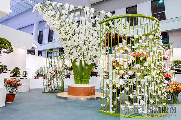 走進館內(nèi),各種浙江特色新優(yōu)園林園藝植物產(chǎn)品、花藝作品、盆景作品等,讓人忍不住駐足停留。最引人注目的,則是以一朵朵白色的蝴蝶蘭花朵與仿竹構(gòu)筑物營造的立體景觀,結(jié)合蒼翠欲滴的竹林背景和浙派山水盆景,營造出綠意盎然、生機無限的風(fēng)景畫卷。寓意浙江是“綠水青山就是金山銀山”理論的發(fā)源地,表現(xiàn)浙江始終踐行“綠水青山就是金山銀山”的理念、大力推進生態(tài)文明建設(shè)取得的巨大成就。