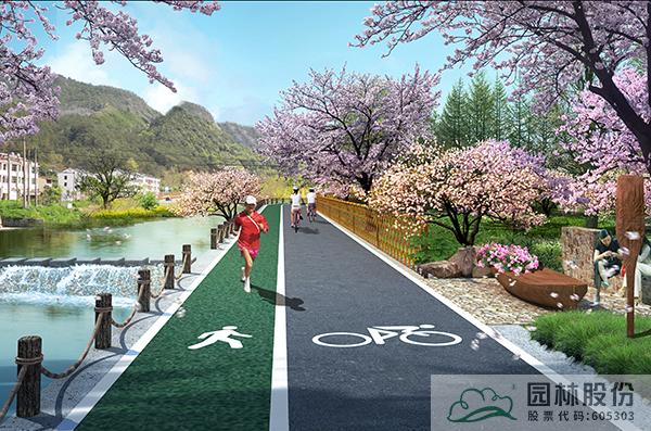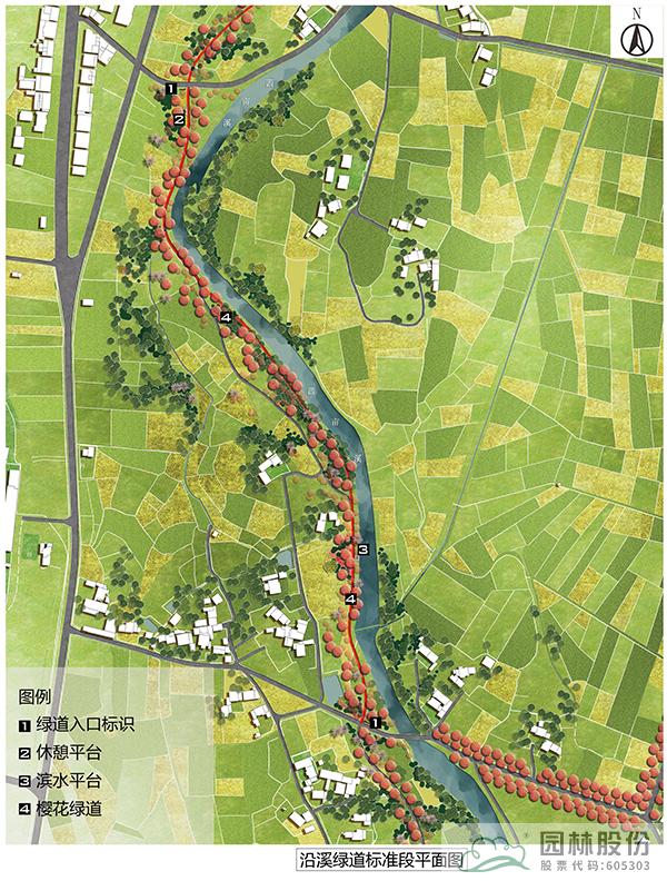 沿溪綠道為櫻花環(huán)中濱河段落,該標(biāo)準(zhǔn)段長度為730m,總長2590m。以春季櫻花為主題,打造浪漫的濱水慢行系統(tǒng),沿線打造休憩空間,設(shè)置休憩設(shè)施,并在入口處設(shè)計(jì)特色標(biāo)識,成為村民通行休閑健身的浪漫步道。
