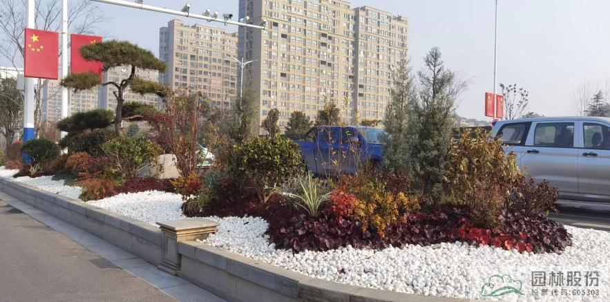 在江山大道與黃山路、黃浦江路與項(xiàng)王路路口在植物配置上,采用群落結(jié)構(gòu)、組團(tuán)配置和盆景化的自然式造園手法,在空間、色彩、節(jié)奏方面獨(dú)具匠心,打造了高低錯落、疏密有致的和諧景觀。考慮到行車安全性與視線誘導(dǎo)因素??紤]到行車安全性與視線誘導(dǎo)因素,中央綠化隔離帶以黑松樁的種植片段和花鏡+球類的自然群落片段進(jìn)行循環(huán),打造規(guī)則中有自然的效果。機(jī)非綠化隔離帶以黑松樁+花鏡種植,打造艷麗的春景效果。