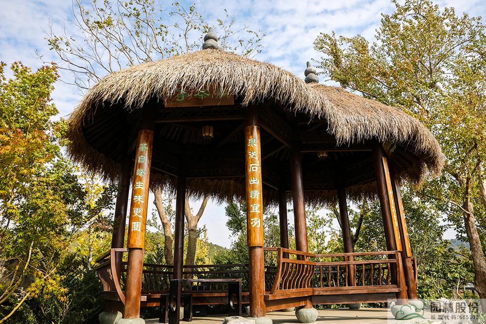 走出湖畔居,沿著山石小道拾級而上,來到“問茶”展區(qū)。伴著翠綠的茶葉和淡淡的茶香,登上杭州園的制高點——茅草雙亭。茅草雙亭有兩塊匾額,一塊是“問茶”,一塊是“聽泉”?!皢柌柰ぁ闭胺降膸字瓴铇涫遣鑸@的點睛之筆,設計靈感取自“西湖龍井十八棵御茶”。在亭子邊還有一處泉眼——“滌心”,“滌心”是乾隆皇帝御題的“龍井八景”之一,寓意溪水清澈,心靈清凈。