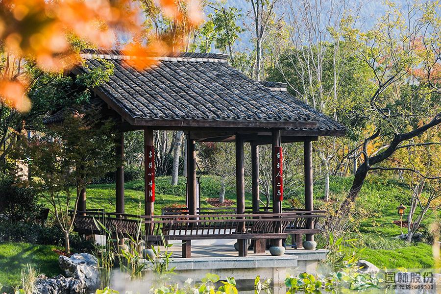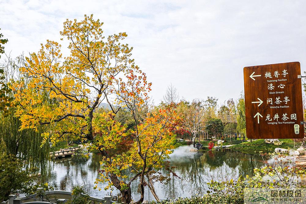 契合展區(qū)主題的樾香亭臨湖而立,雙坡屋面,八柱敞亭,柱子上書五言聯“魚樂人亦樂,泉清心共清”,盡顯悠閑舒適的情趣。在亭內憑欄而坐,側耳聽風雨,迎風嗅花香。抬頭遠望,荷葉亭亭的水面上,有魚兒在水中嬉戲;曲折的長橋上,游人在漫步觀景;水岸邊,銀杏、三角楓、烏桕等色彩繽紛,編織出一幅深秋的美麗畫卷。