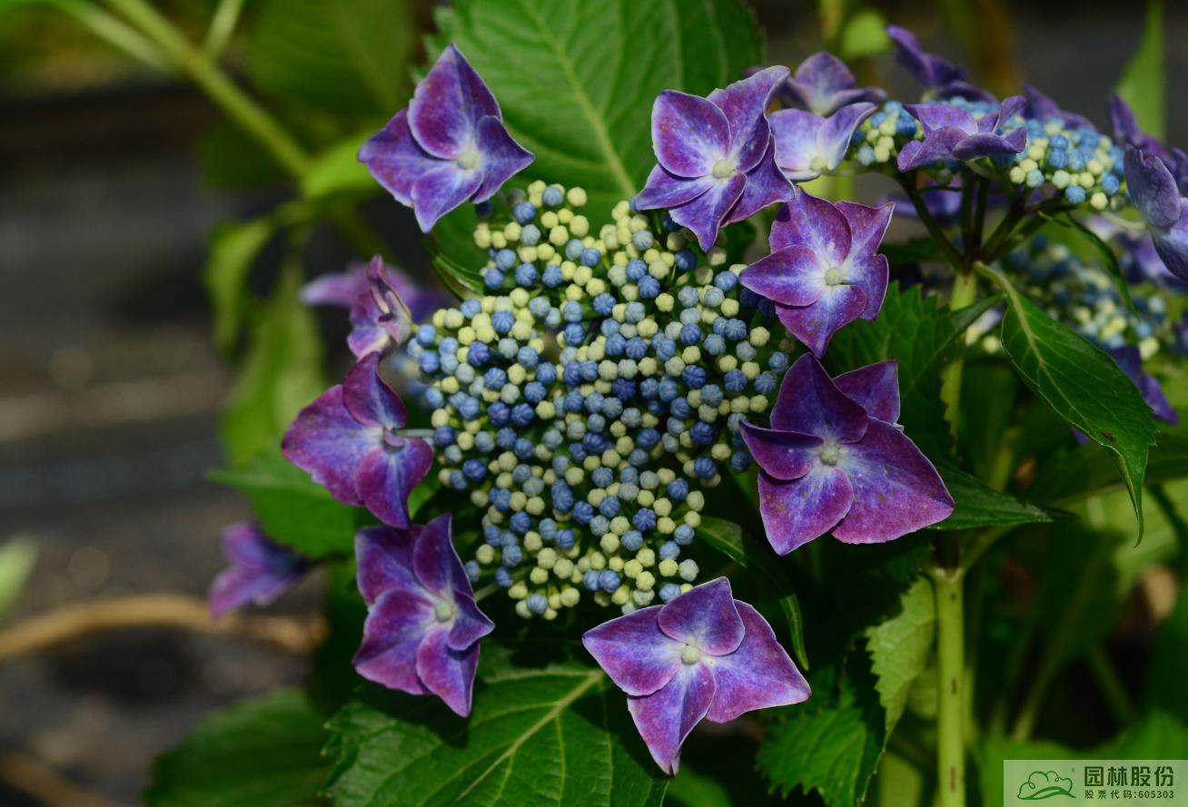 大葉繡球‘紫之夢’:傘房狀聚傘花序盤狀,高度2~4cm,直徑8~12cm,上海及杭州5月中下旬開花,可延續(xù)至6月下旬;不孕花主色紫紅色先端白色中部藍(lán)色,基部白色;可孕花花瓣藍(lán)色;花序直立性強(qiáng),花色艷麗,花量大,開花能力強(qiáng),適合家庭園藝和各式園林景觀。