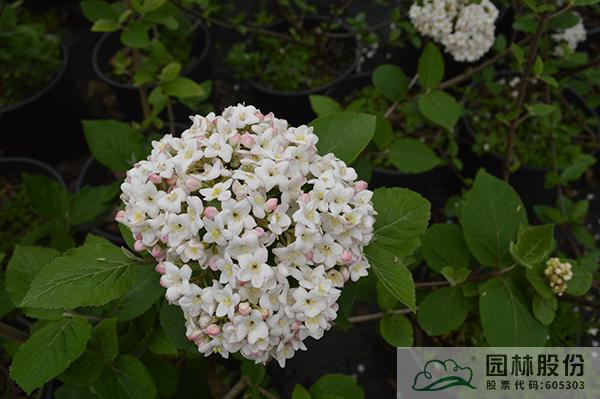 忍冬科莢蒾屬,落葉灌木,株高3-4.5 m,為瓊花和紅蕾莢蒾的雜交種。葉片較厚,較大,到秋季變成酒紅、橙紅或紫色色調。聚傘花序花蕾粉紅色,開放后白色,聚集似小雪球,具芳香,花徑8-14cm,花期3-4月。喜光,半陰環(huán)境也生長良好,生長速度中等;擇土不嚴,微酸性、中性至微堿性土壤均可生長,尤喜濕潤、排水良好的富含有機質土壤;抗寒性強;耐修剪,適合自然風格的工程應用或庭院觀賞。