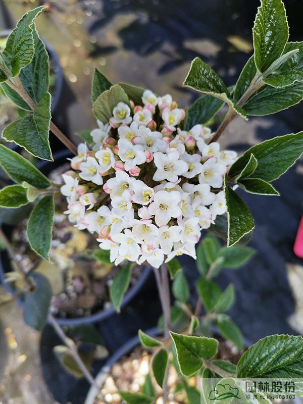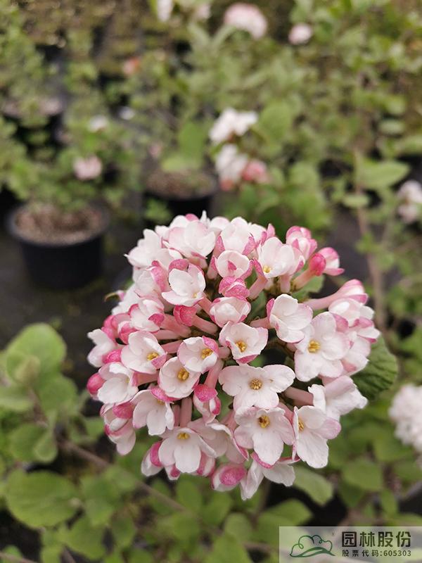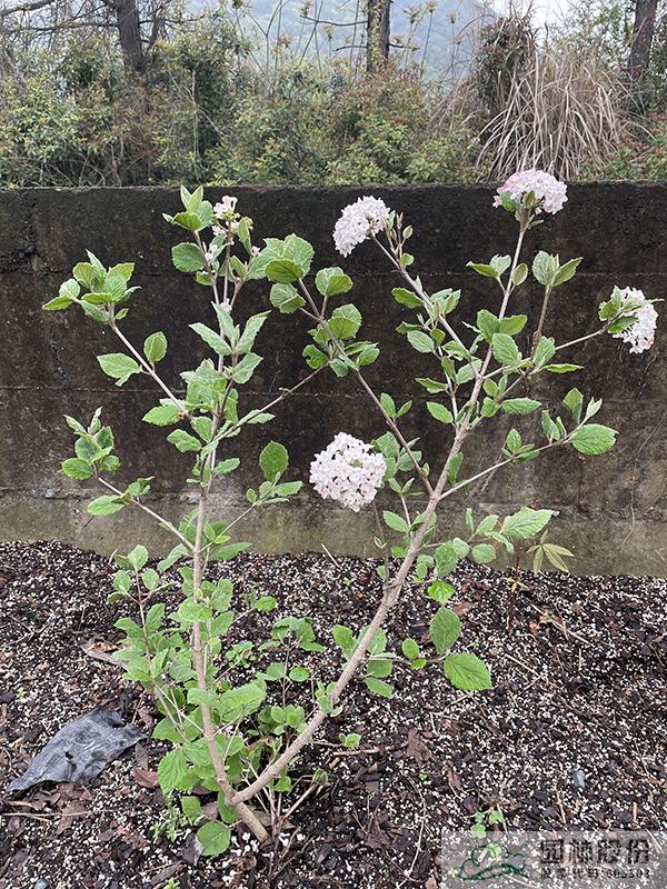 忍冬科莢蒾屬,半常綠或常綠灌木,株高2-3 m,為紅蕾莢蒾和煙管莢蒾的雜交種。葉色深綠,秋季轉紅,顏色程度因所處地區(qū)而異。該種繼承了紅蕾莢蒾粉花的優(yōu)良基因,花序未開放時呈現靚麗的粉色,開放后白色,且具有較濃郁的花香。花徑一般4.5-10 cm,花期3-4月。植株具有良好的頂端優(yōu)勢,枝條年生長量大,但分枝能力稍弱。幾乎無病蟲害。適應性強,生長速度快,耐干旱且耐寒,適合自然風格的工程應用或庭院觀賞。